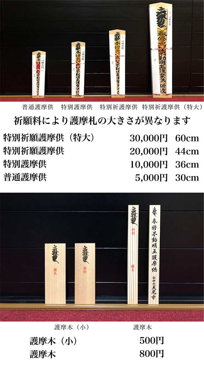 また、護摩供養で、祈願・開眼した護摩札は、不動明王の分身であり、常に私たちをお護りくださいます。